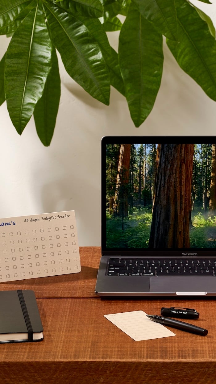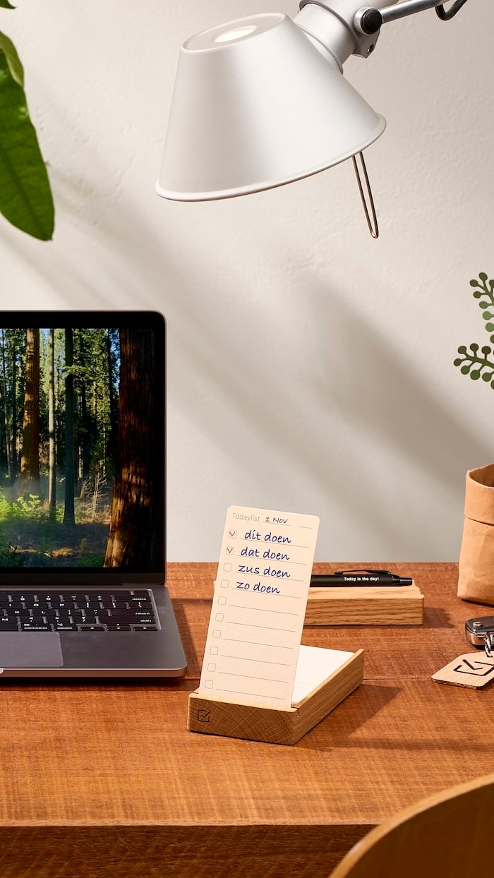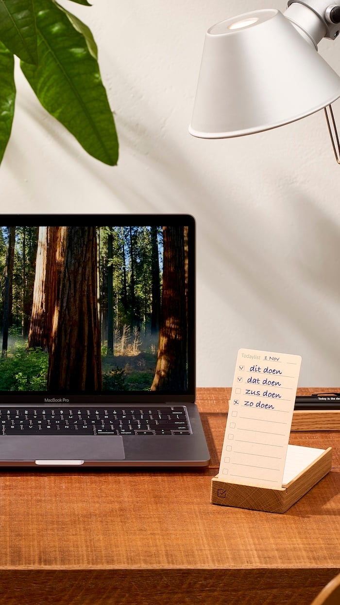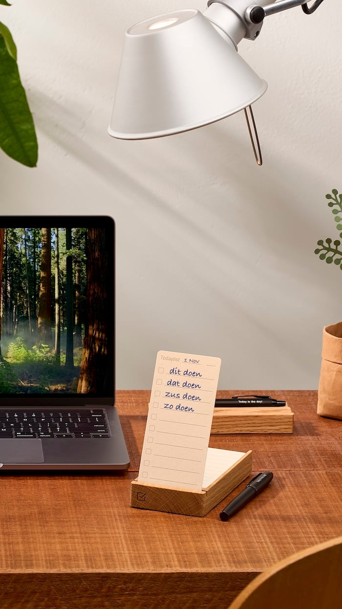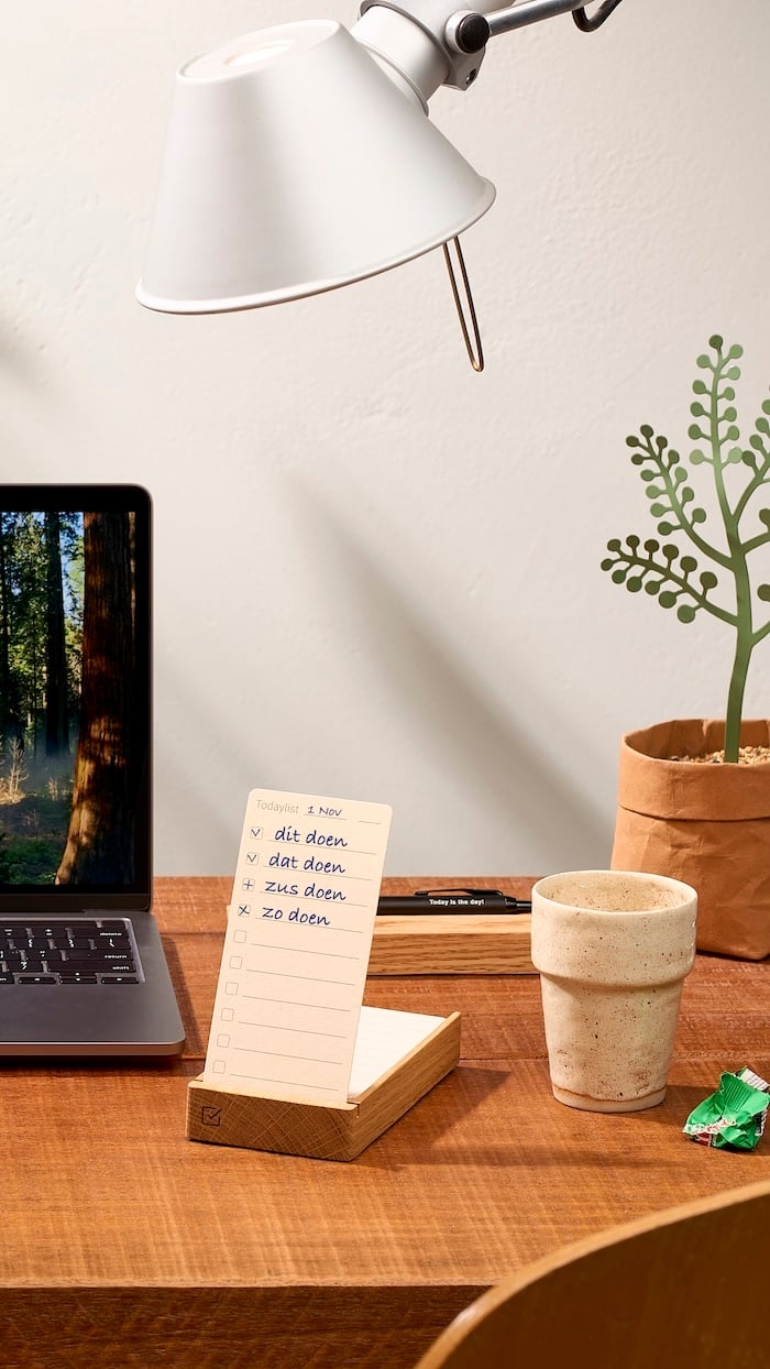 Per dag één kaartje met alleen de taken voor één dag. Bewust schrijven, met pen op papier. Altijd zichtbaar op je werkplek.