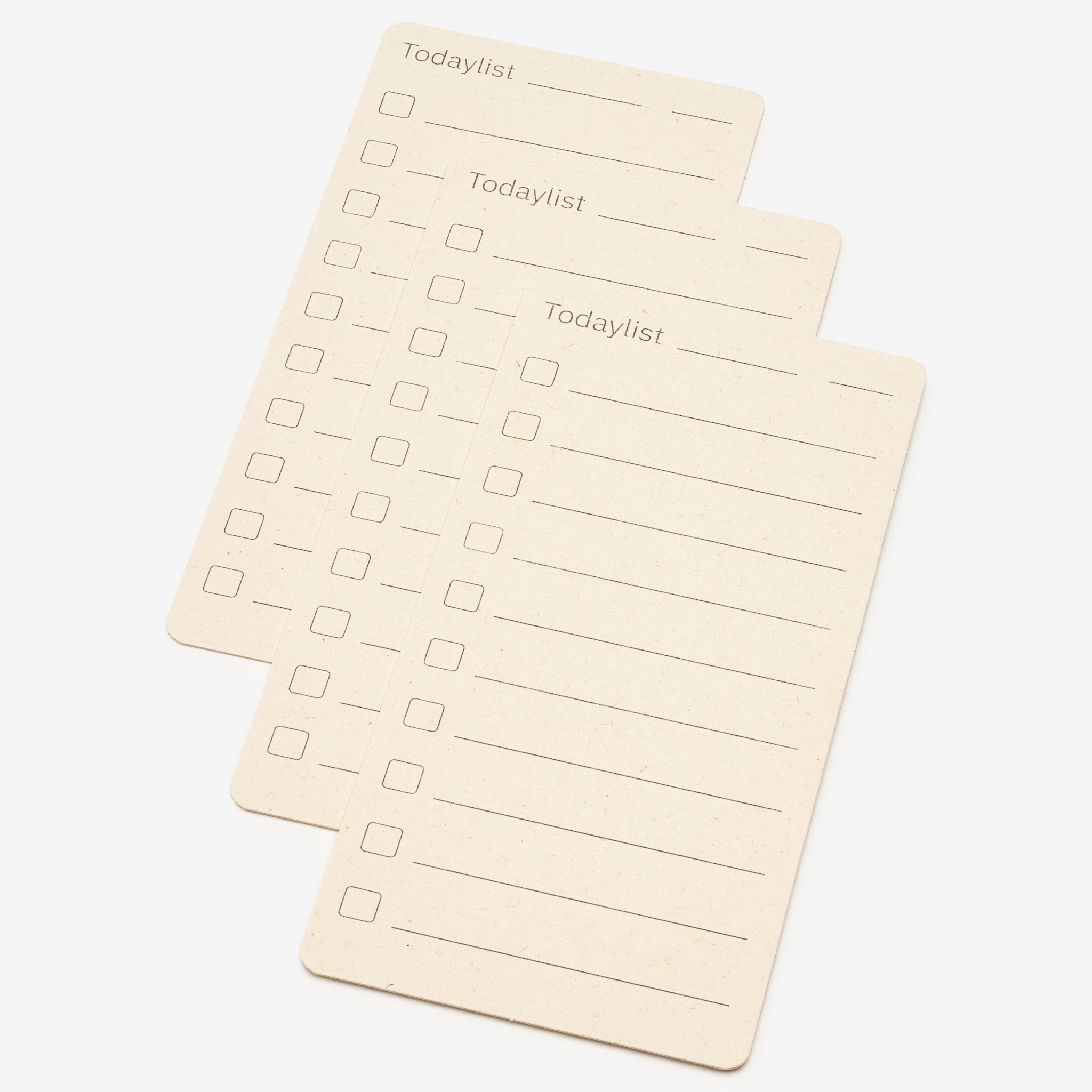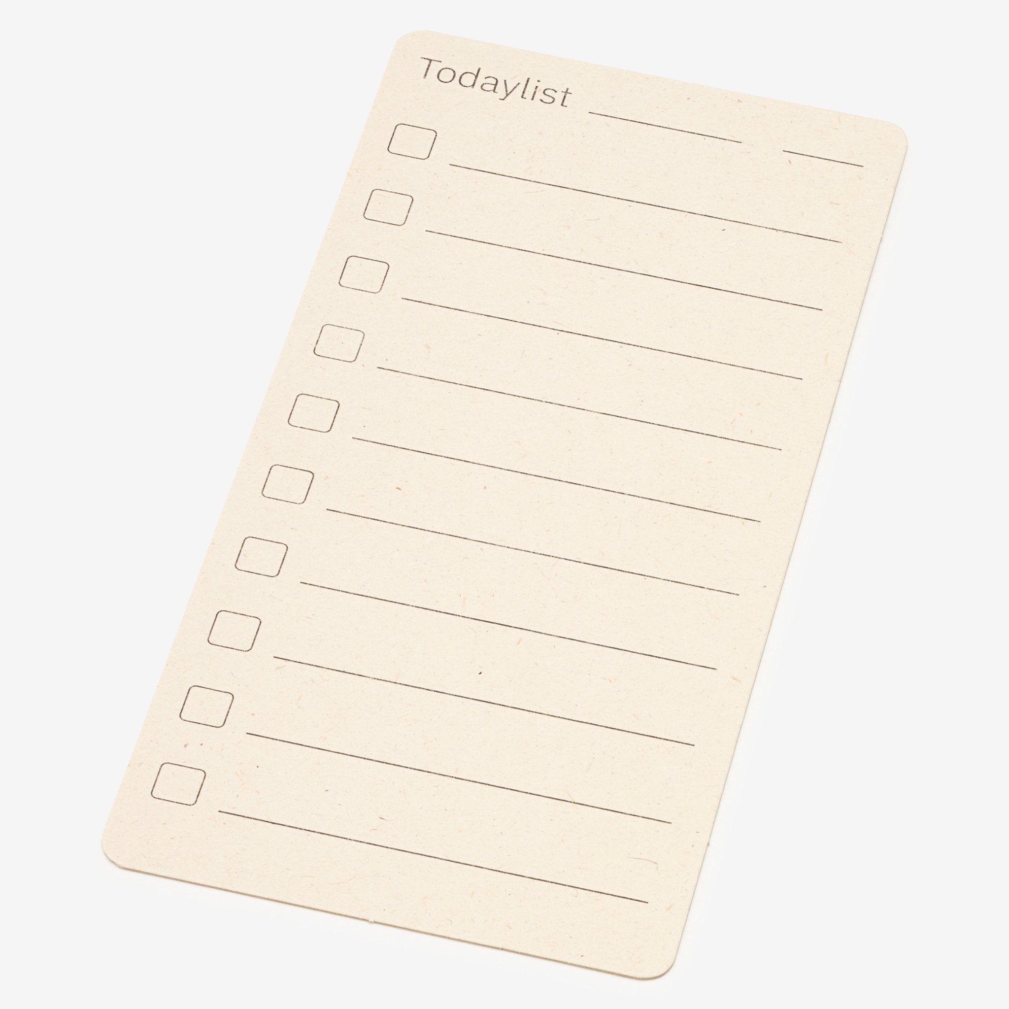 In één doosje zitten genoeg Todaylists voor een hele maand. En een paar extra, voor als. Is de maand voorbij, dan bewaar je de gebruikte Todaylists weer in het doosje.